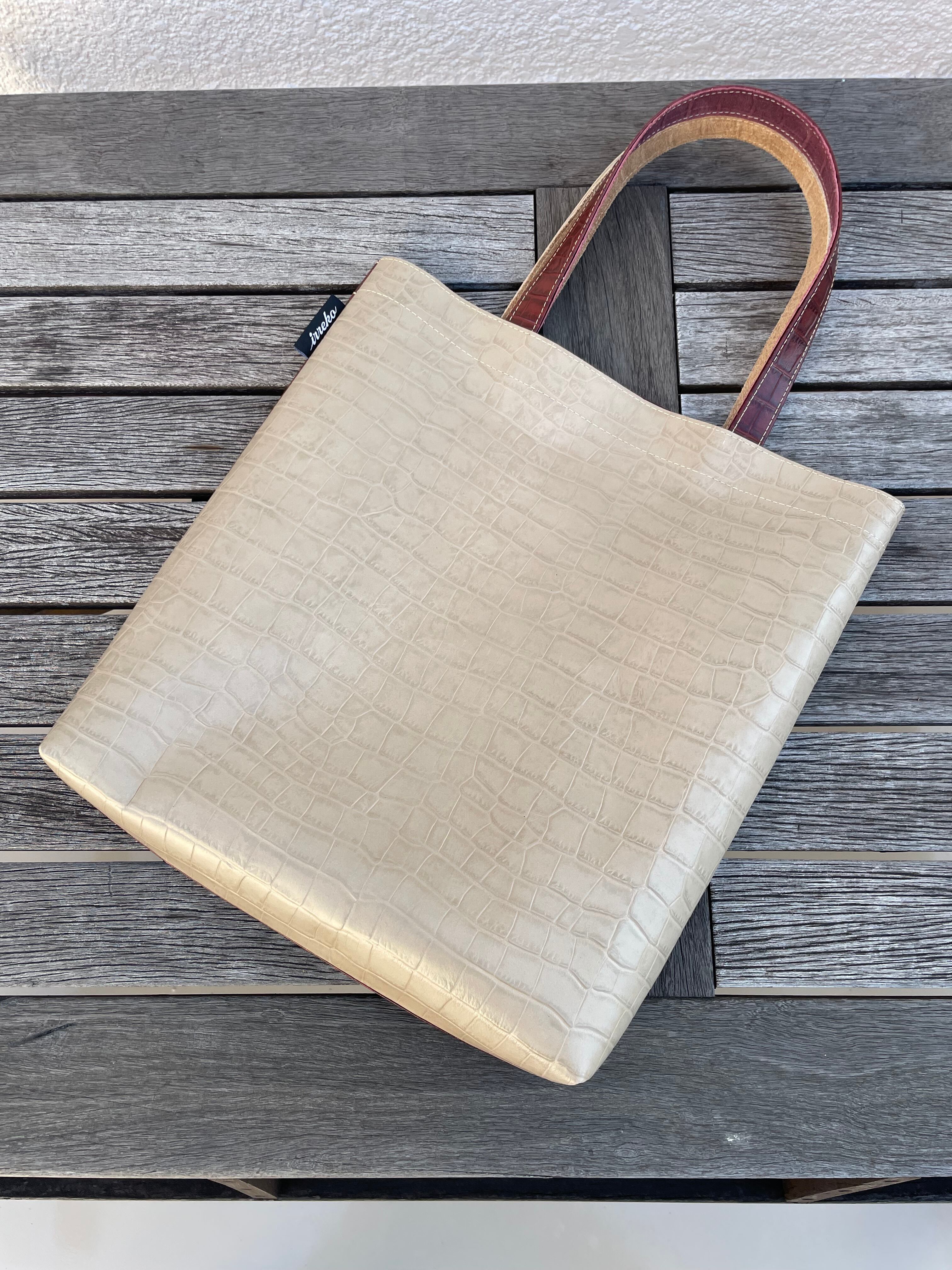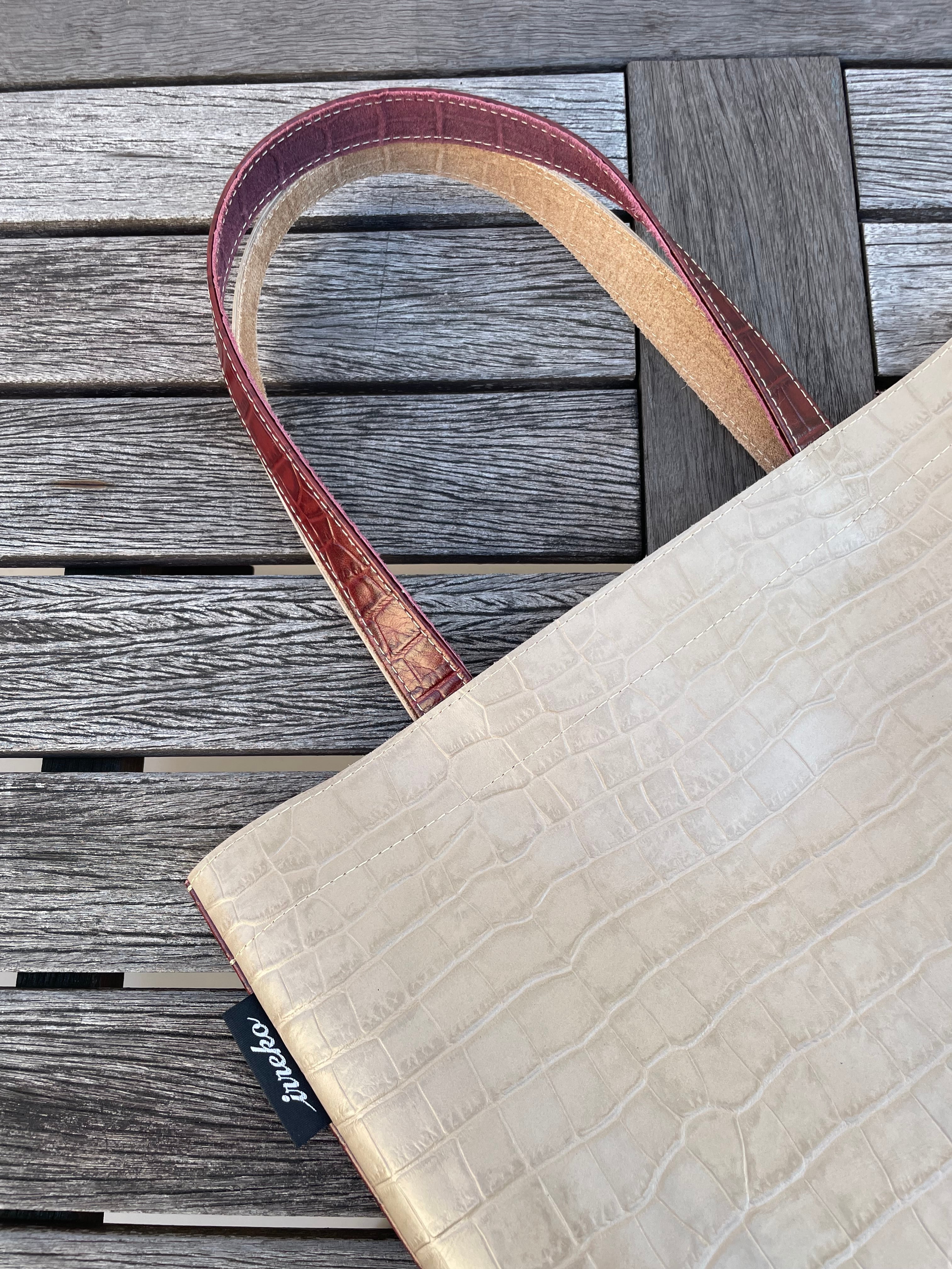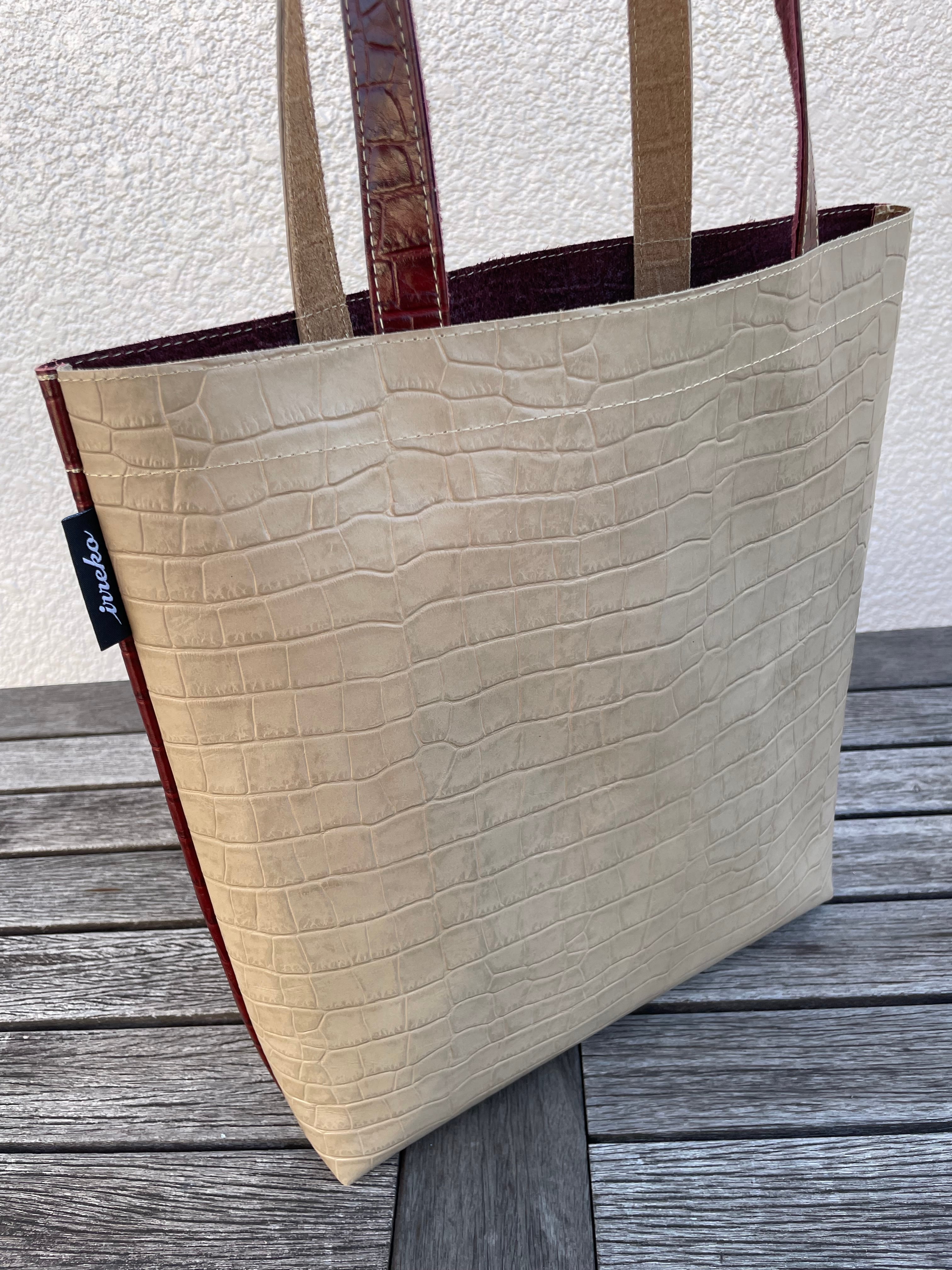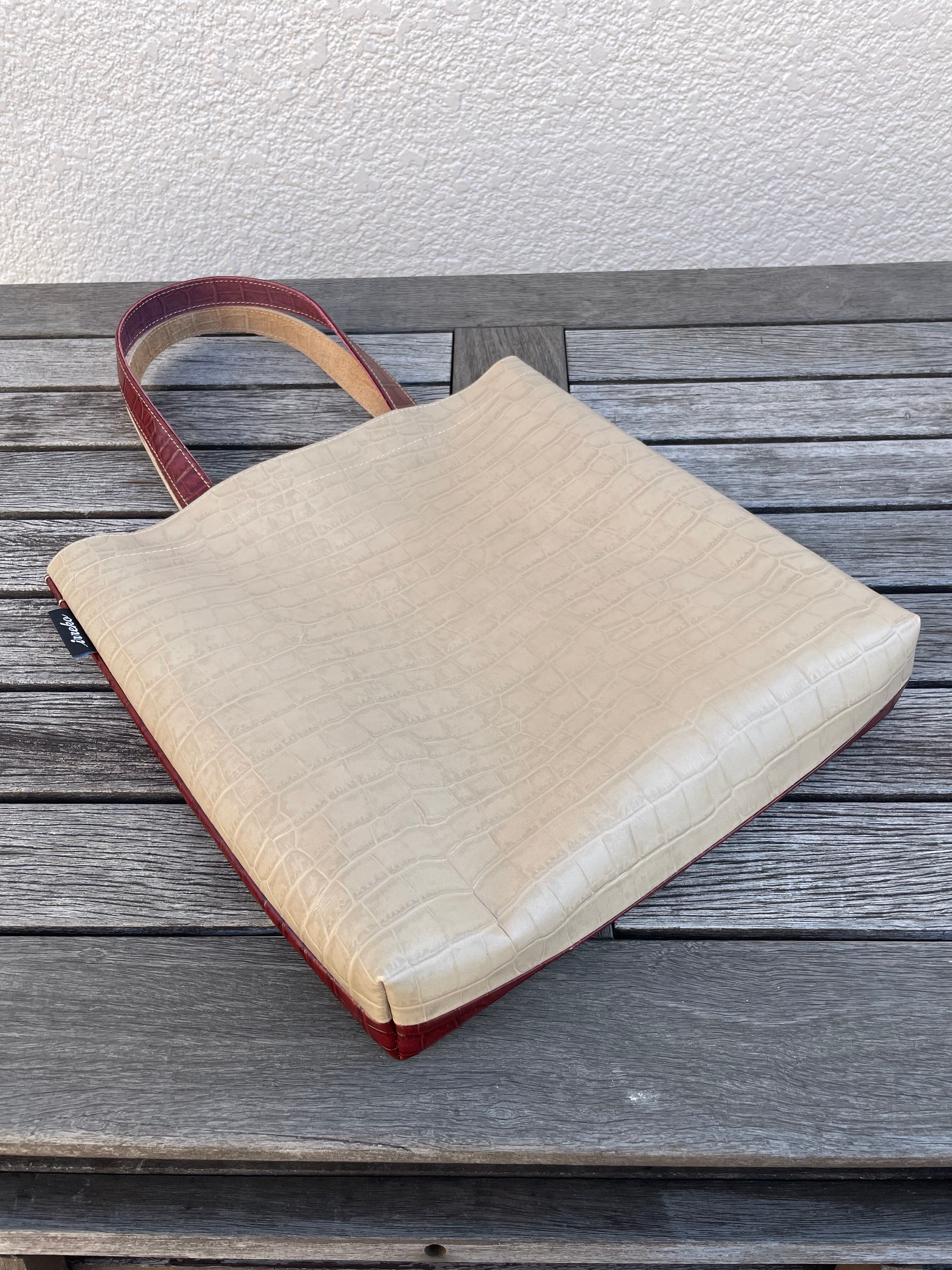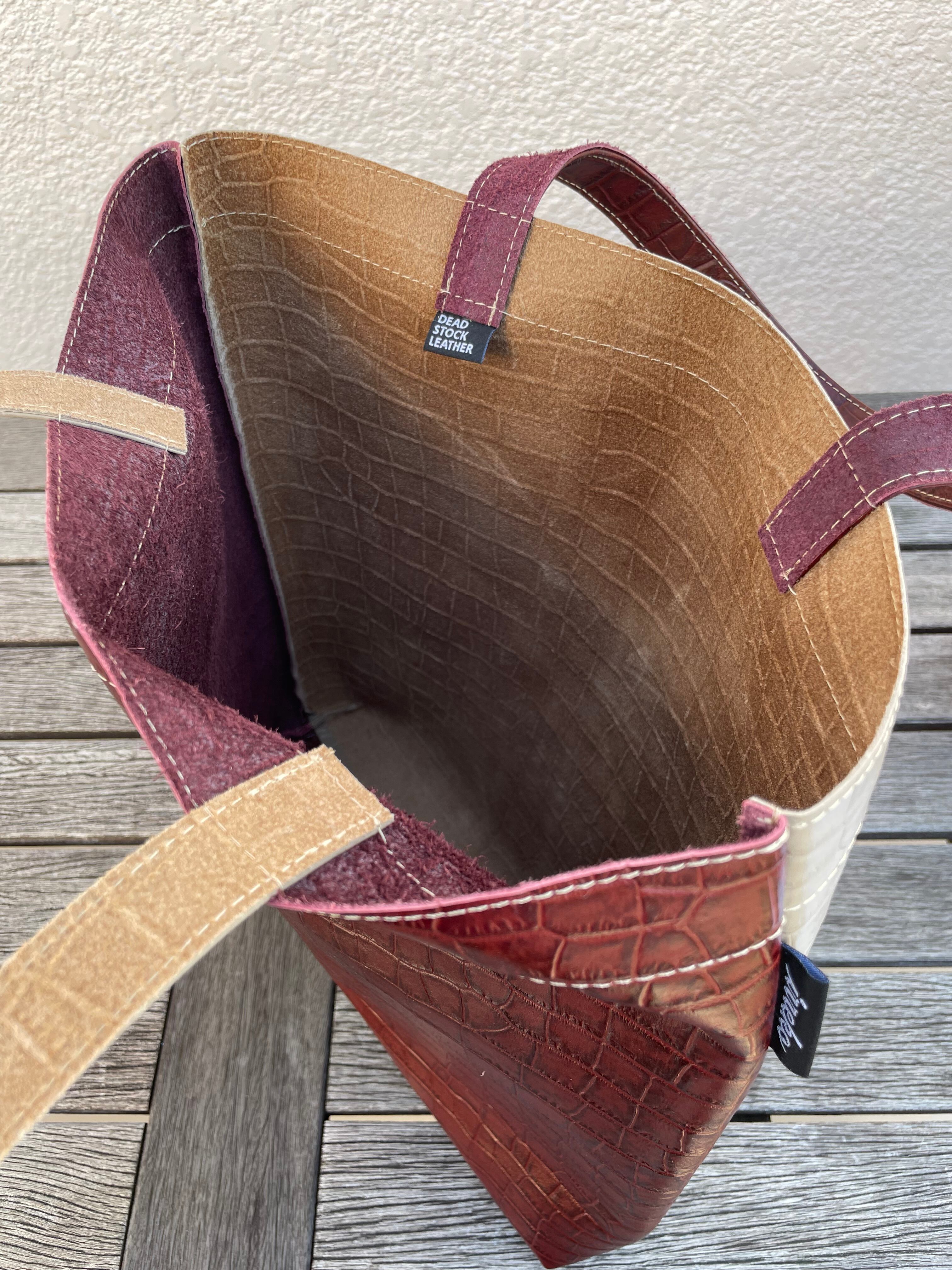 クロコの型押しが印象的なレッドブラウンとベージュの組み合わせは、重厚感と、とびきりの存在感を漂わせます。重厚なレッドブラウンと柔らかなベージュのコントラストは上質さと華やかさが共存する仕上がりになっています。